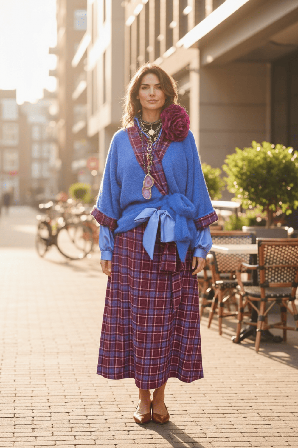Изработен од волнен тартан во темно пурпурна и сина шема, комплетот вклучува класична долга сукња и меко плетено кимоно во кралско сино.