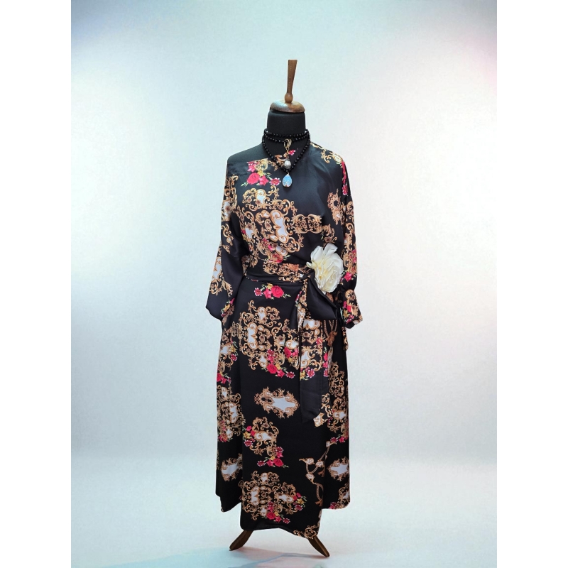 комплетот „Black Renaissance“ е изработено од висококвалитетен сатен вискоза што паѓа елегантно по телото и дава раскошен изглед. Долгиот крој и врвката на половината овозможуваат прилагодливо носење и максимална удобност. Барокниот принт во златно и розово додава нота на луксуз, што го прави совршен избор за вечерни пригоди, свечени настани или уметнички настани.