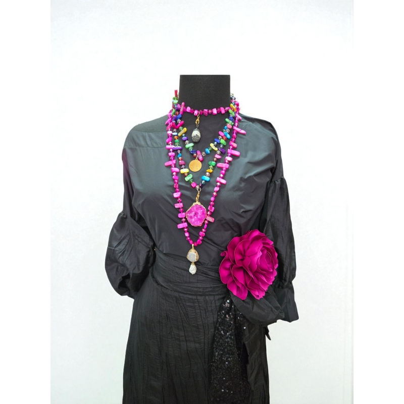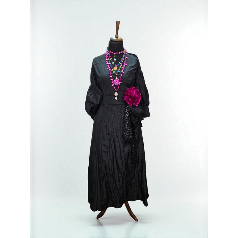 Елегантен дводелен комплет изработен целосно од 100% тафта свила, дизајниран да ја долови современата софистицираност и безвременскиот шарм. Силуетата е збогатена со суптилни текстурални контрасти и украсена со рачно изработен цветен брош за смел, но префинет изглед. Совршен за вечерни настани, специјални пригоди и луксузни собири.