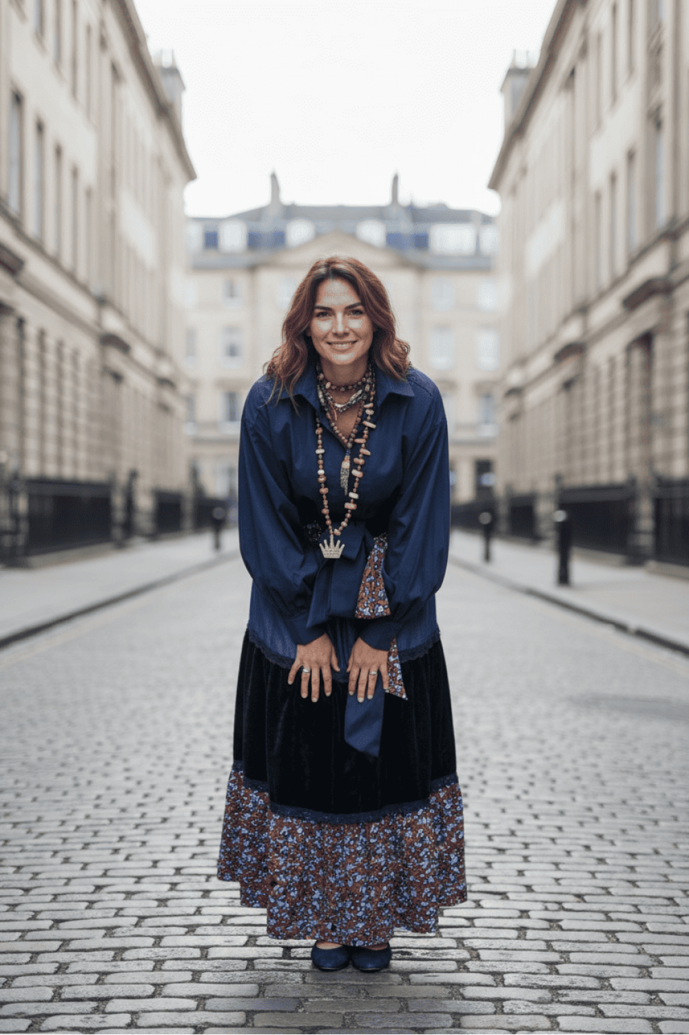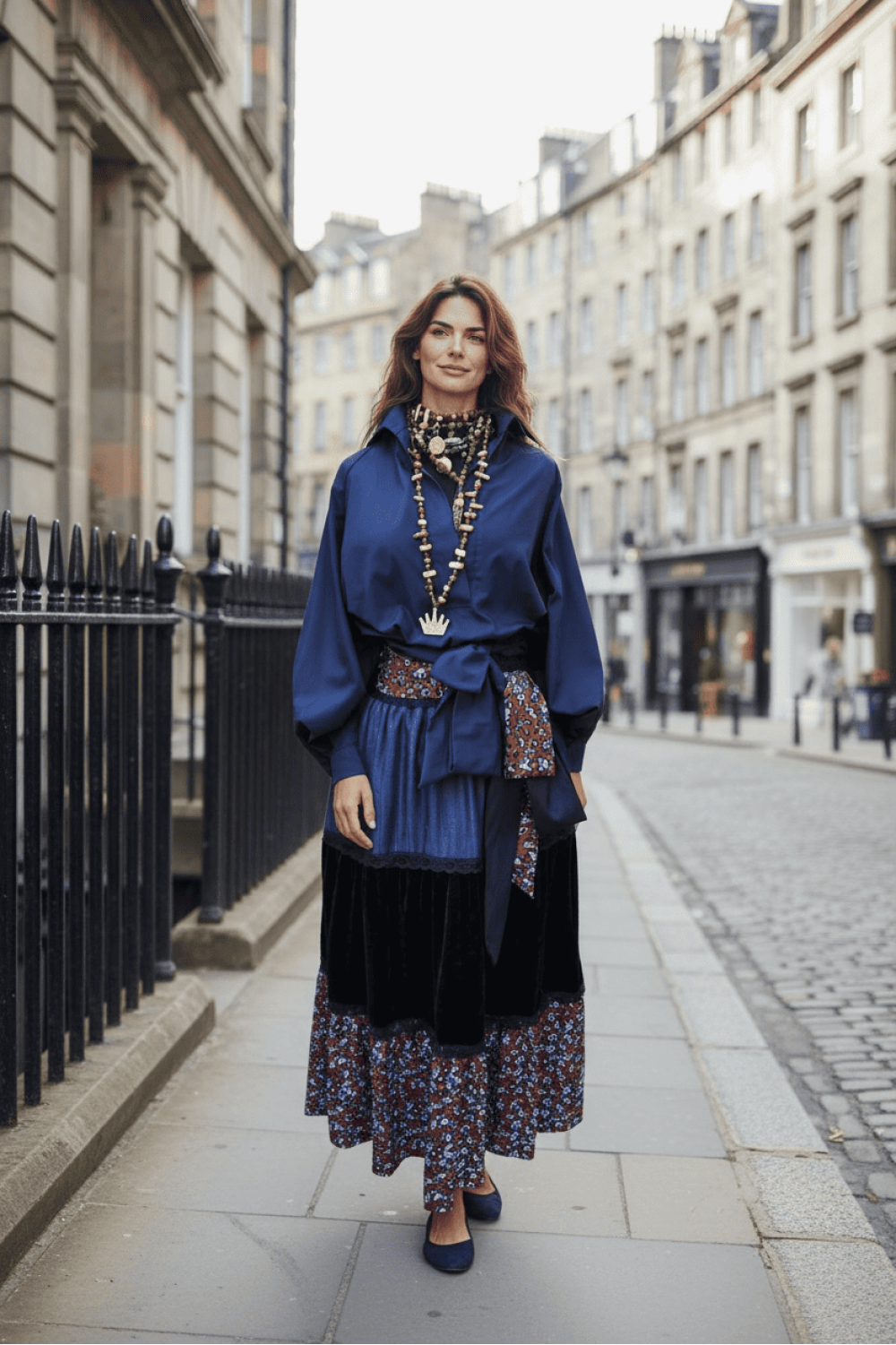 Кошулата е изработена од структурирана тафта свила во темно морска сина боја со појас за врзување, додека здолништето комбинира памучен принт во богати темни тонови.