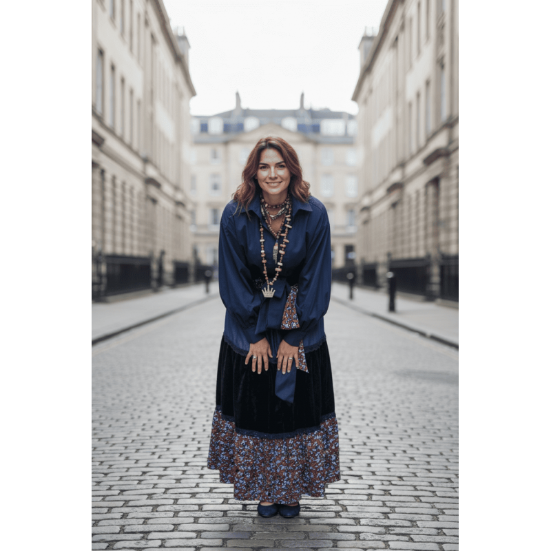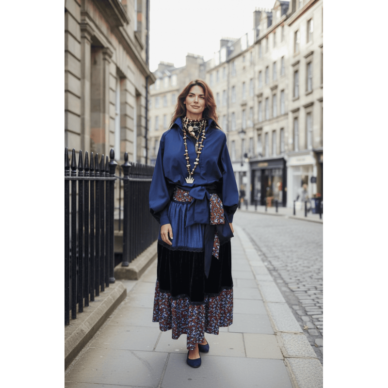 Кошулата е изработена од структурирана тафта свила во темно морска сина боја со појас за врзување, додека здолништето комбинира памучен принт во богати темни тонови.