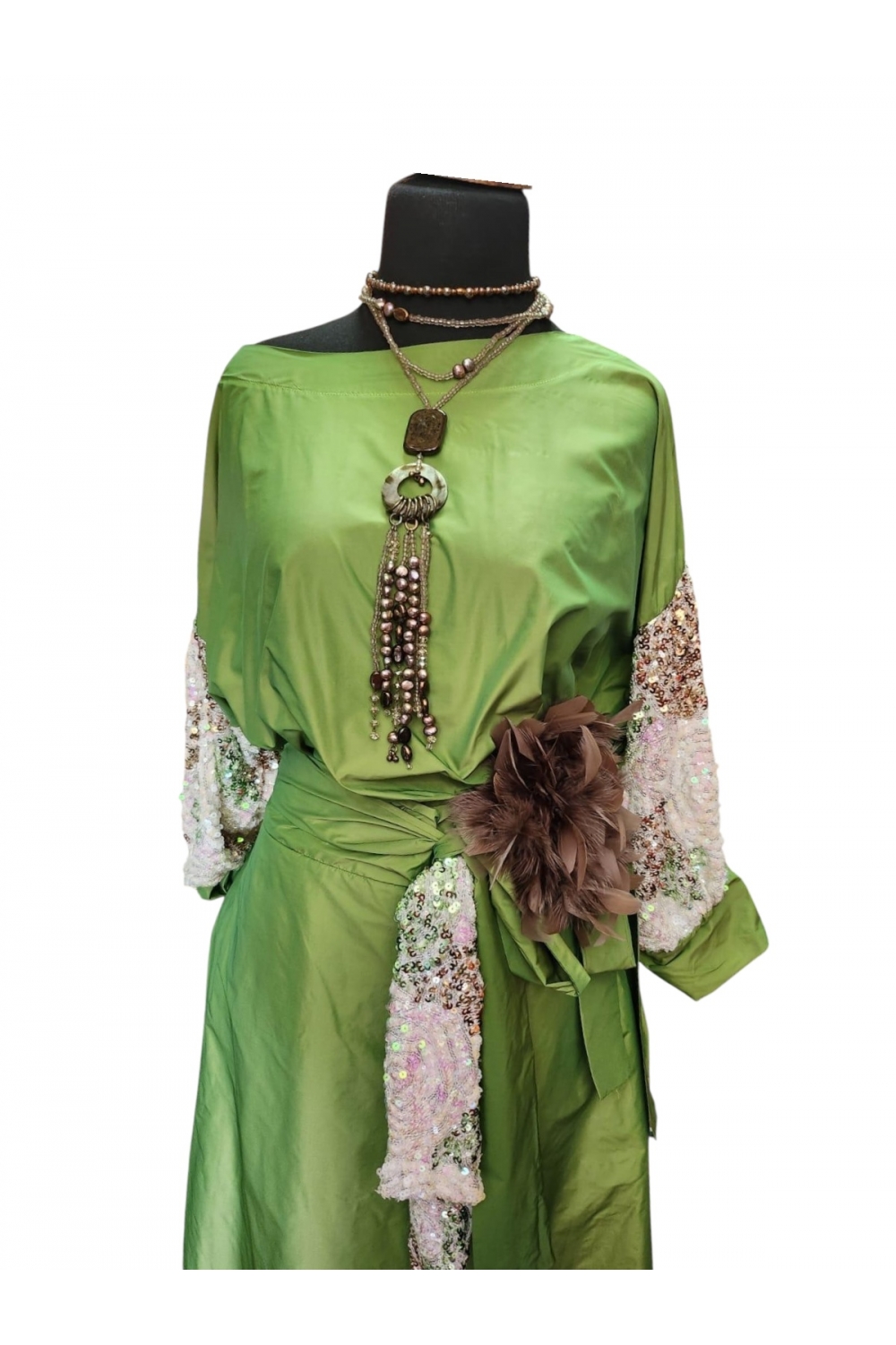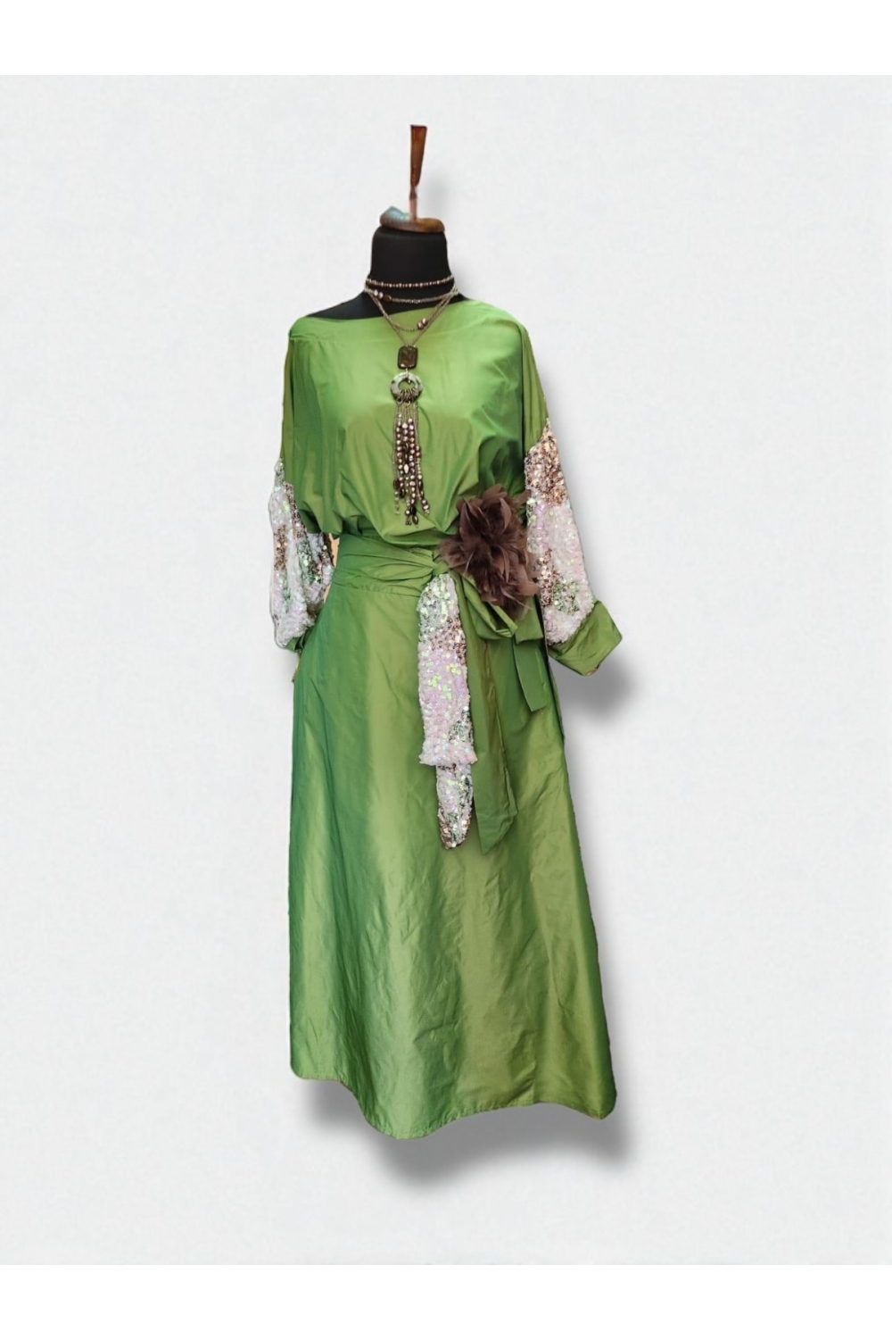 Овој елегантен комплет изработен од тафта свила со блескави пайети е вистински израз на луксуз и женственост. Зелената боја и раскошната текстура го прават совршено парче за свечени настани, гала вечери или специјални прилики.