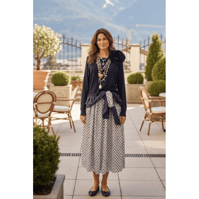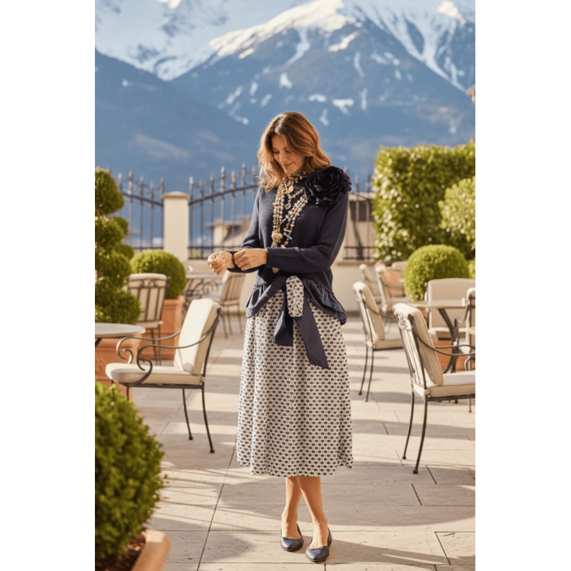 Овој лелеав кардиган е вистинска дефиниција за тивка елеганција и софистицирана женственост. Изработен од мека, лесна плетенина, тој паѓа природно по телото и создава елегантна силуета без напор. Декоративниот цветен акцент на рамото додава уникатен, уметнички карактер, додека врзувањето во половината овозможува прилагодливо носење.