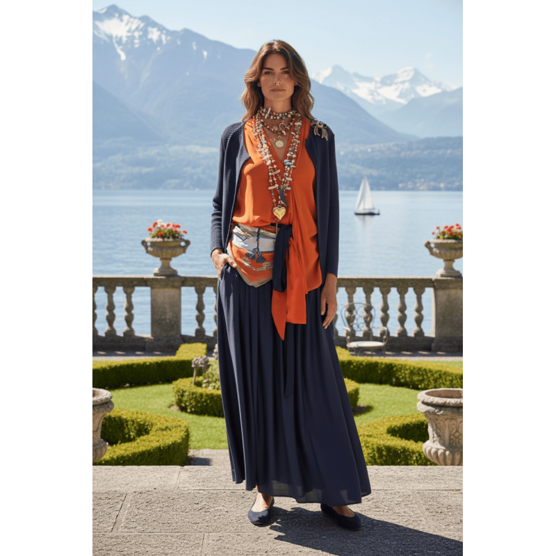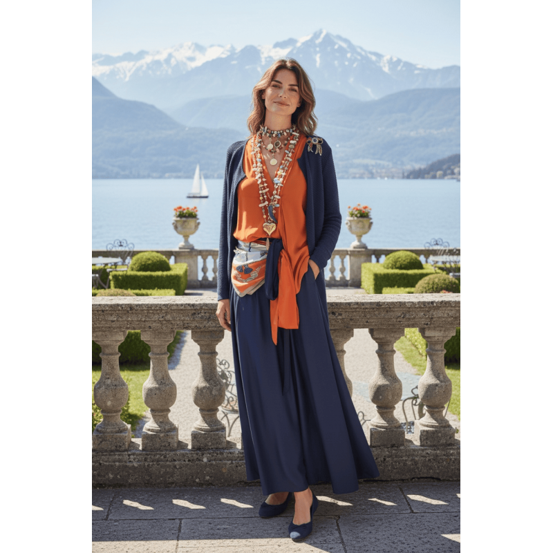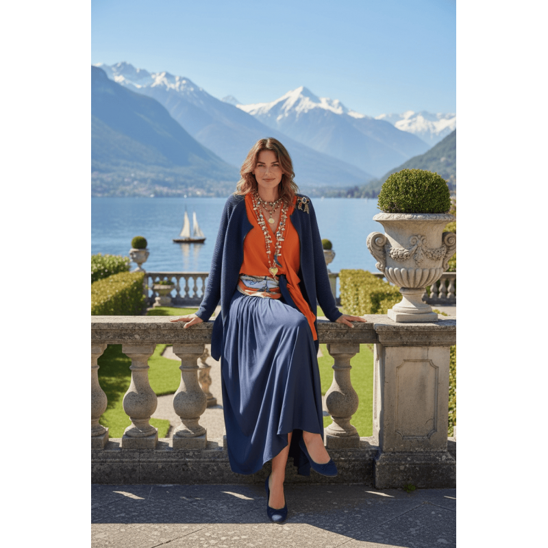 Овој плетен кардиган во длабока темно сина нијанса е создаден за моменти на тивка елеганција и природен луксуз. Со мек, флуиден пад и отворен крој, совршено се надополнува со фустани, здолништа и лесни блузи.