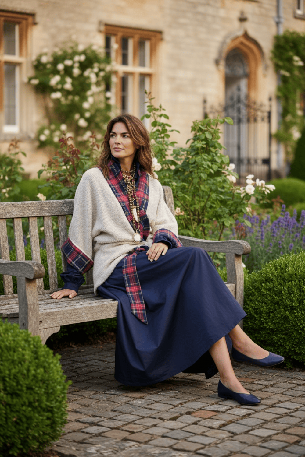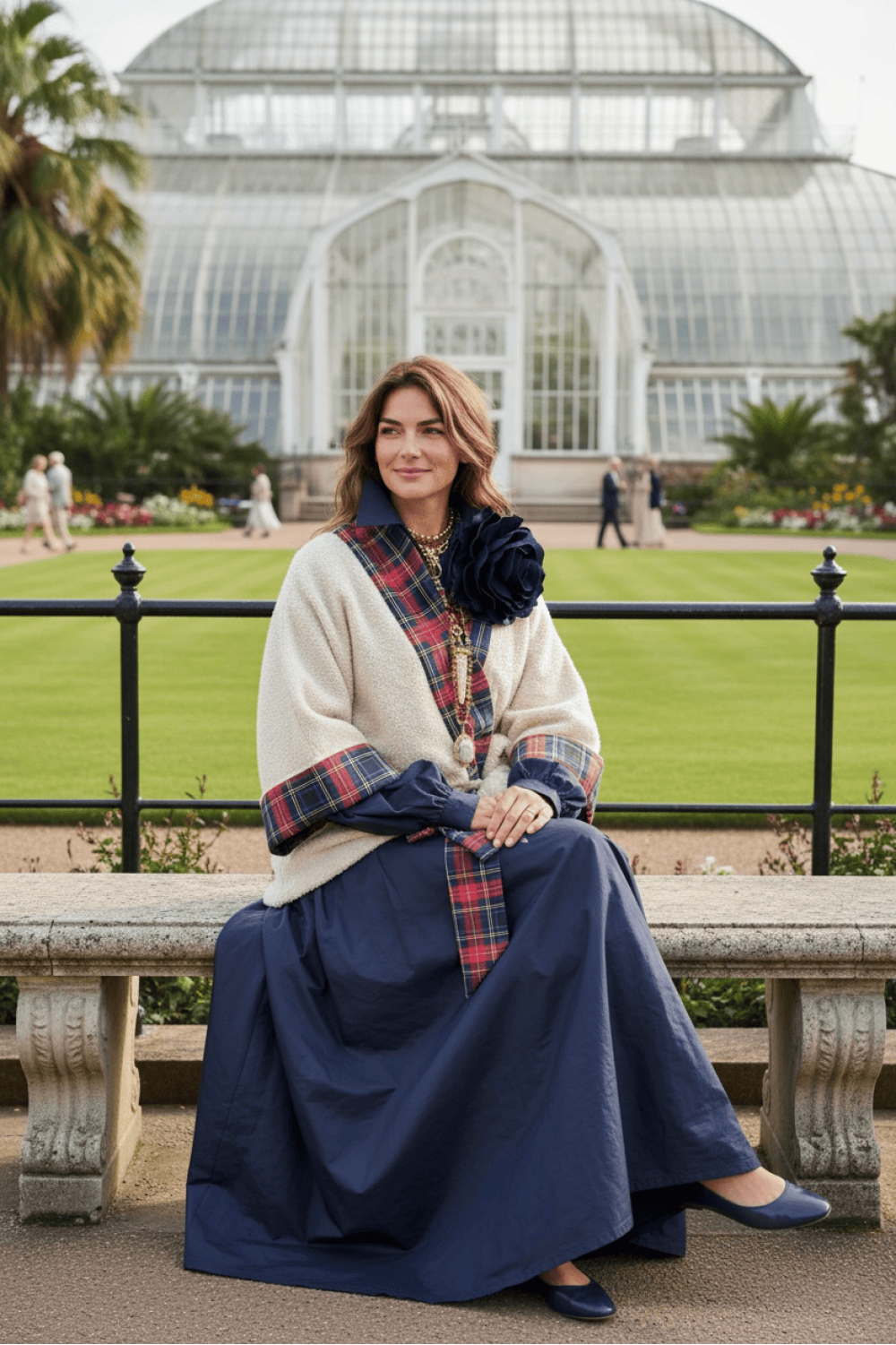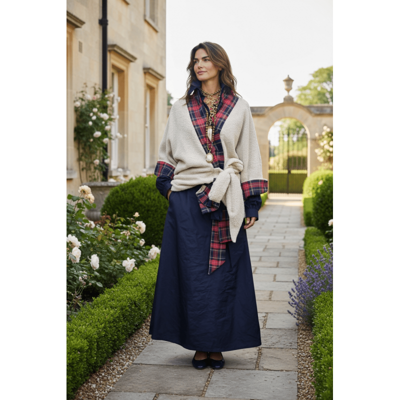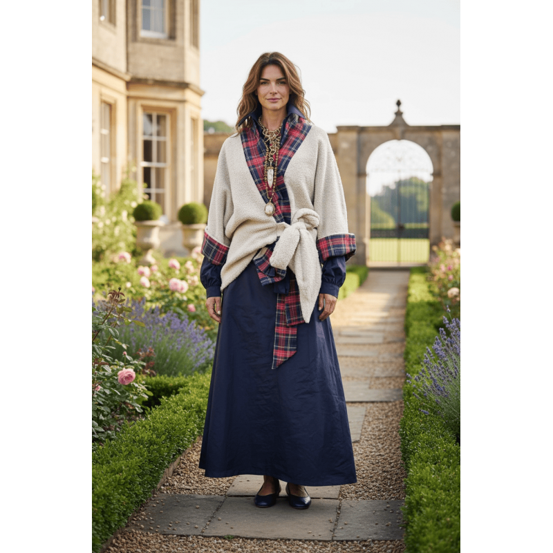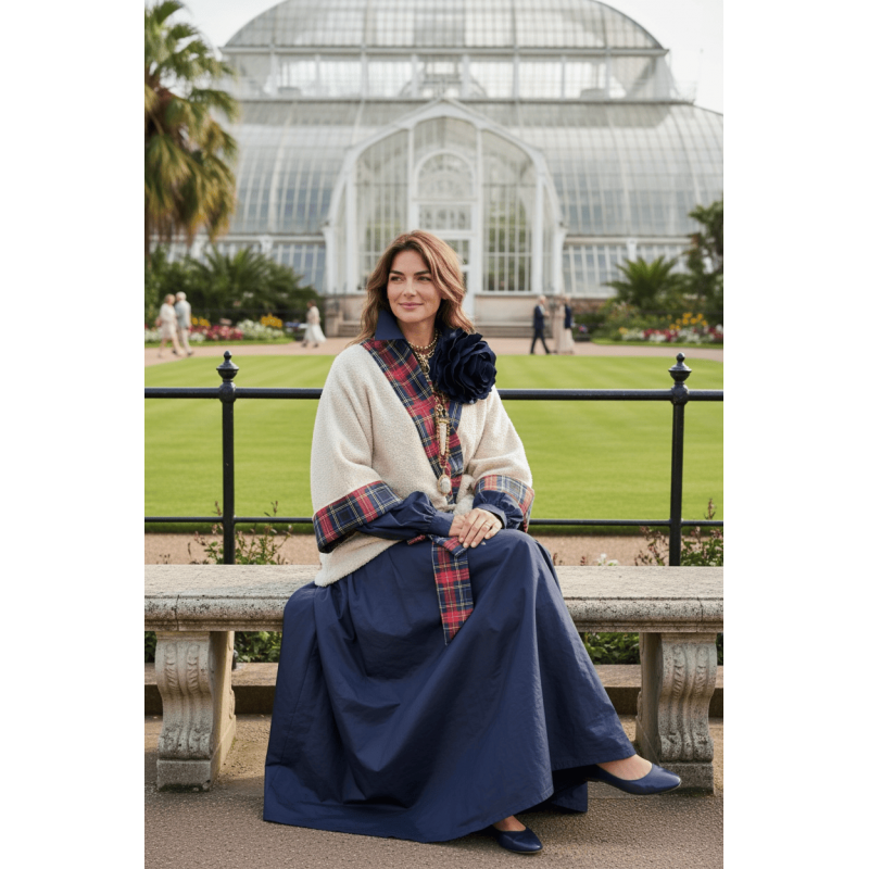 Премиум кимоно инспирирано од англиска аристократска естетика, изработено од ткаенина во крем нијанса, со рафинирани тартан детали. Кимонoто може да се носи врзано со декоративен ремен, создавајќи силуета која е и удобна и женствено струкирана.