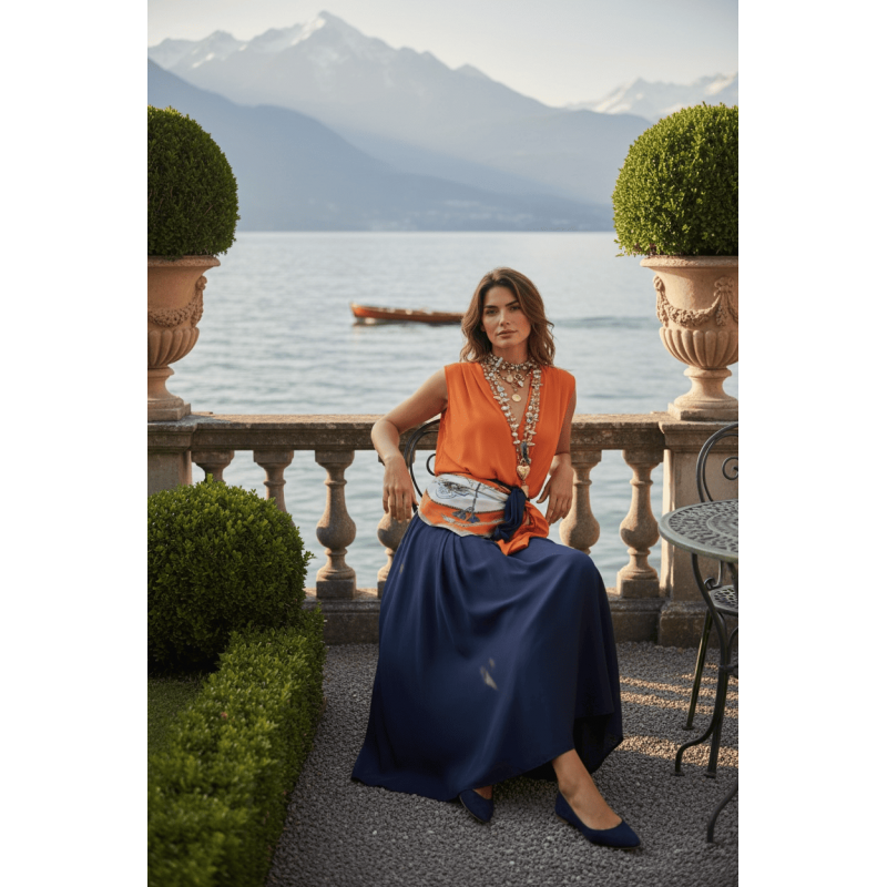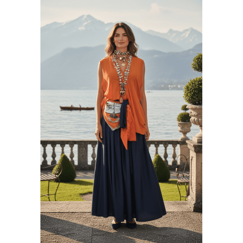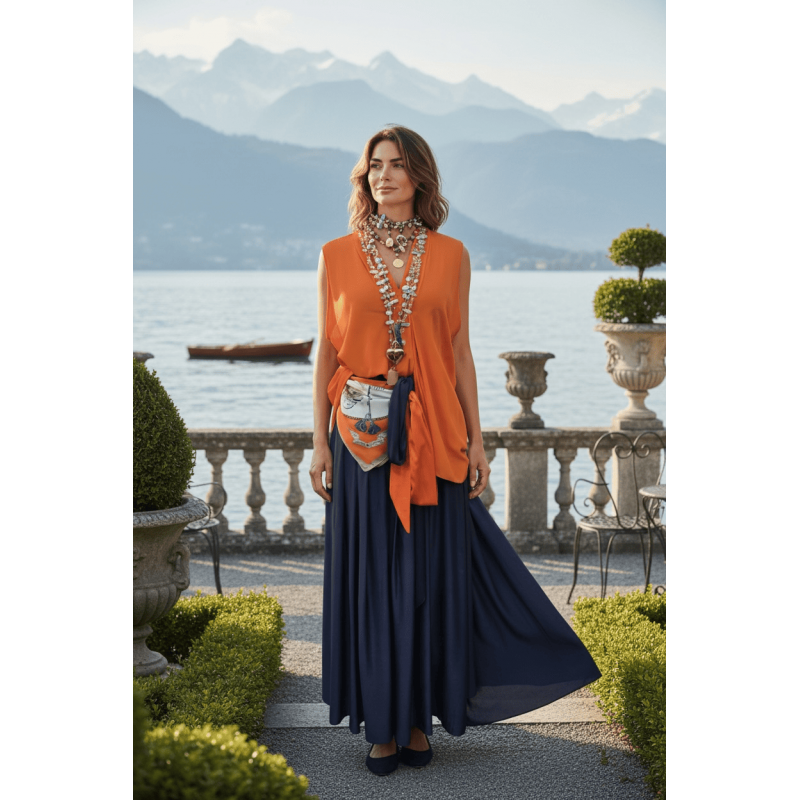 Оваа елегантна блуза без ракави нежно паѓа по телото и создава природна елеганција при секое движење. Длабокиот V-изрез визуелно ја издолжува силуетата, додека страничното врзување додава суптилен акцент и можност за прилагодување на струкот.