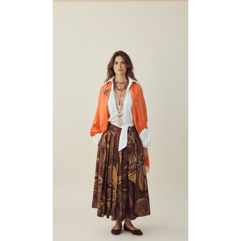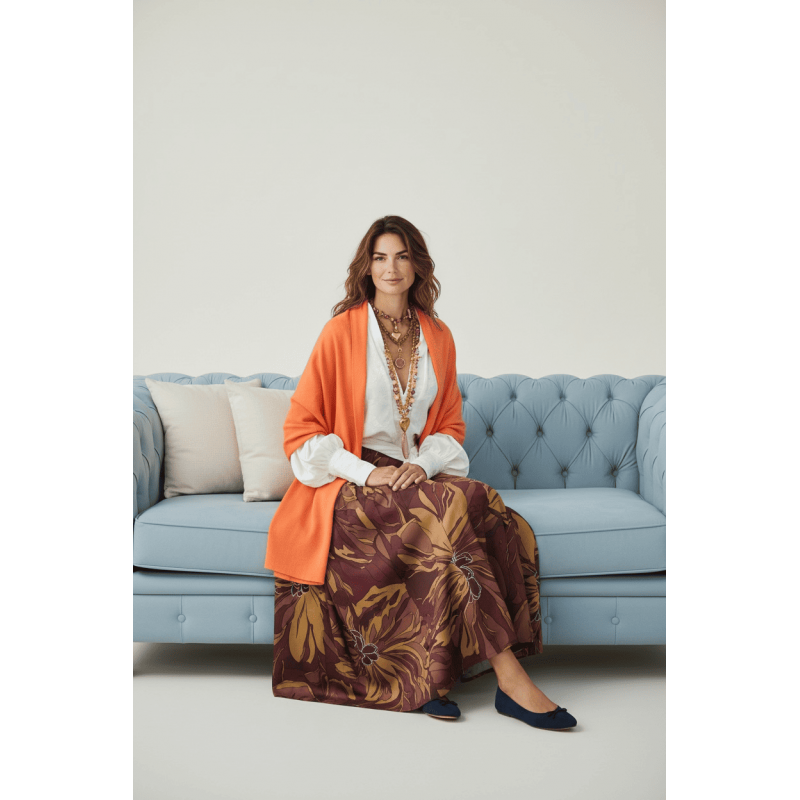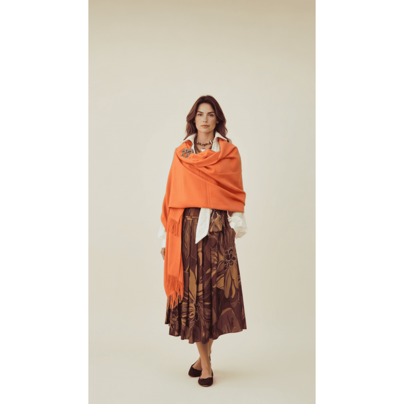 Портокаловиот шал Casa Gracian е изработен за моментите кога едноставноста зборува најгласно. Неговата топла, сончева нијанса додава длабочина и мек контраст на неутрални и темни тонови, додека нежната текстура го обвива телото со чувство на природна удобност.