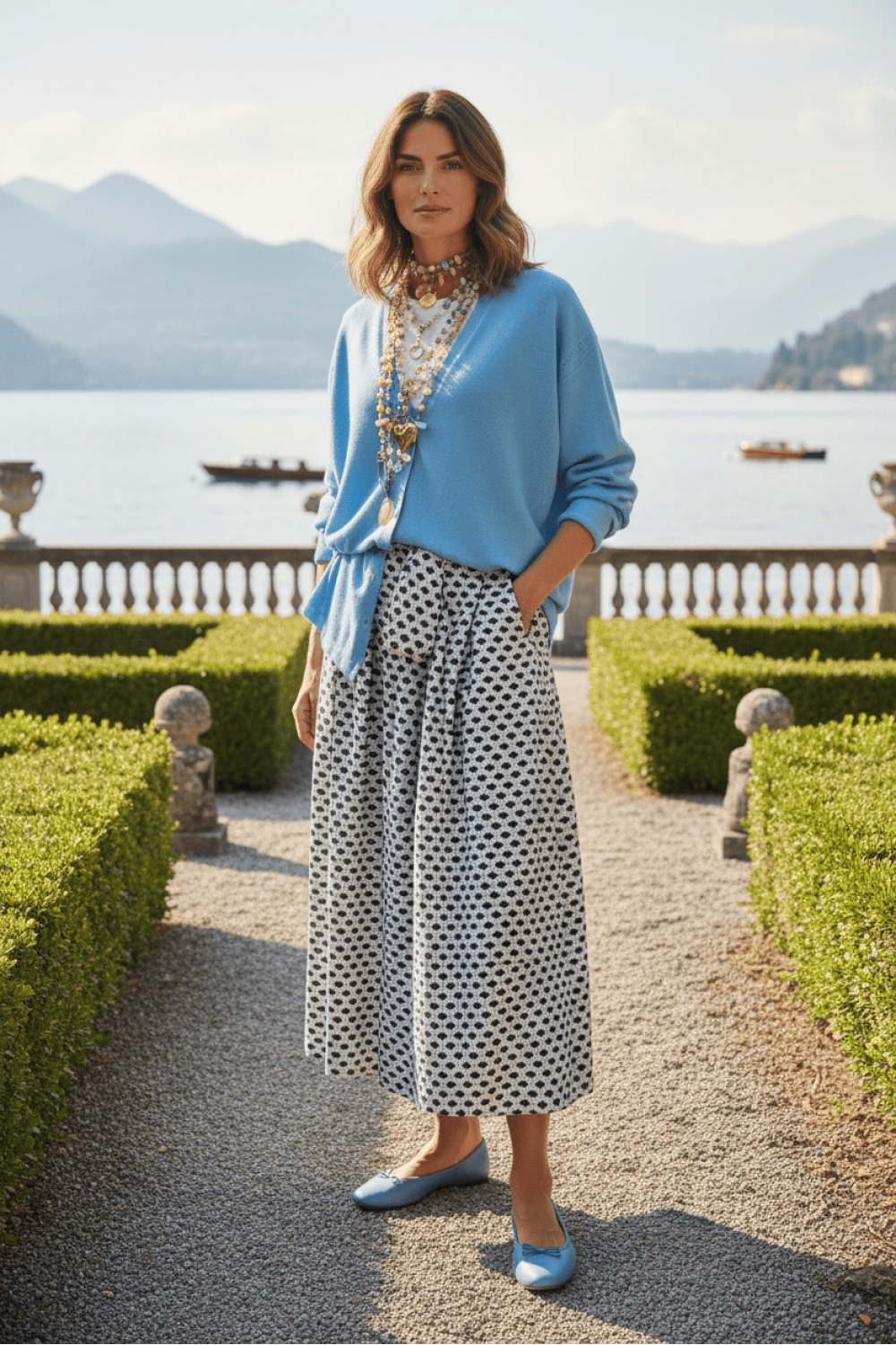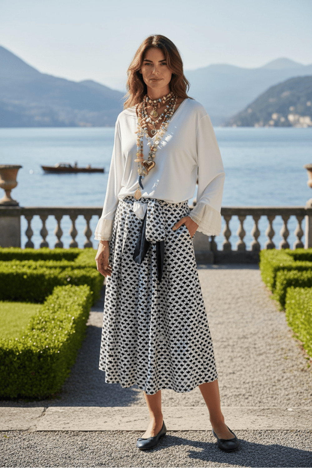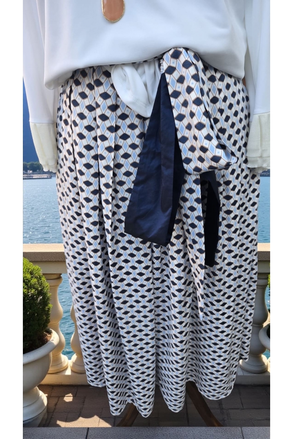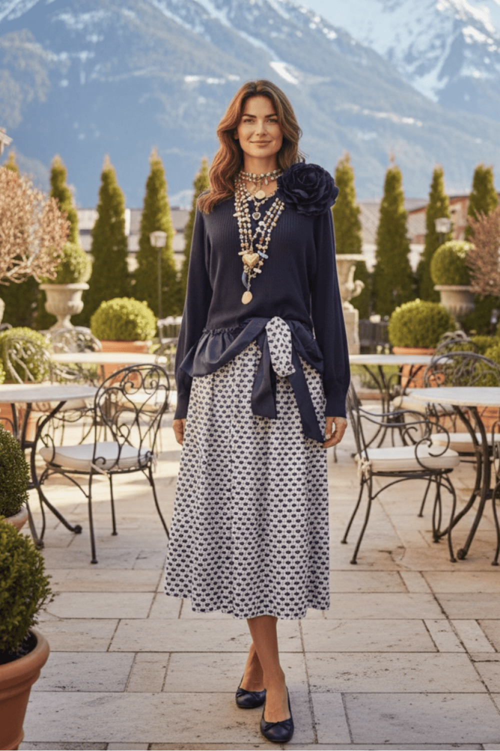 Ова лелеаво здолниште носи тивка елеганција и европски шарм инспириран од алпските пејзажи. Изработено од лесна, пријатна ткаенина со суптилен геометриски дезен, здолништето паѓа природно и создава флуидна, женствена силуета. Врзувањето во половината овозможува прилагодување и дополнителен стилски акцент.