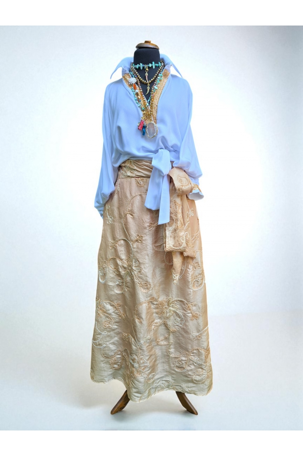 Истовремено гламурозно и софистицирано, ова златно здолниште од 100% тафта свила ќе го претвори секое движење во изјава. Со висок струк, лесно раскроена форма и благ сјај, е совршено за свечени настани, гала вечери и уникатни модни појавувања. Комбинирајте го со елегантна блуза и минималистички накит за беспрекорен изглед