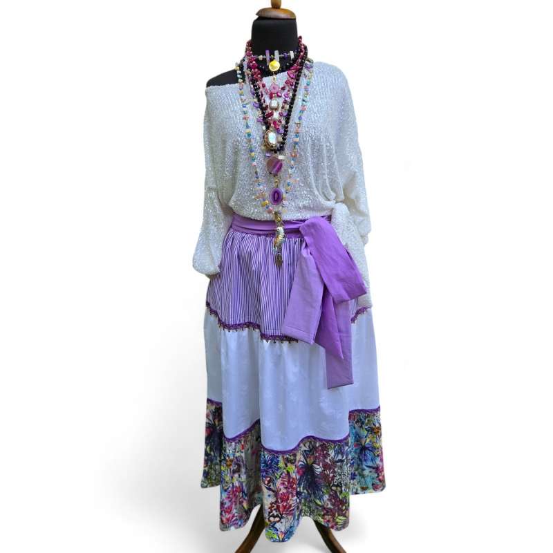 Ова раскошно бохо здолниште е вистинска изјава за стил и слобода. Изработена од различни текстури и принтови – од виолетови риги до флорален дезен во долниот дел – таа раскажува приказна за боемска елеганција. Широкиот крој обезбедува комфор и движење, додека свилената панделка ја дефинира половината со префинетост. Идеална за летни прошетки, уметнички фестивали.