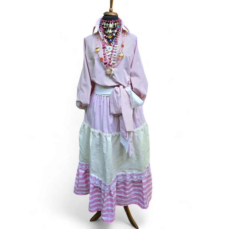 Ова женствено здолниште е рачно изработено од комбинација на памук и лен во неодоливи нијанси на розово, крем и бисерно бело. Долниот дел е украсен со ригиран принт, централниот дел со природен лен, а горниот дел со фино карирано розово. Нежната чипка ја нагласува секоја преливна пруга, додавајќи нота на носталгија и рачна изработка. Со еластичен појас што го прави удобно за носење и елегантно во исто време, ова здолниште е совршен избор за летни прошетки по Медитеранот или за секојдневни стилски моменти.