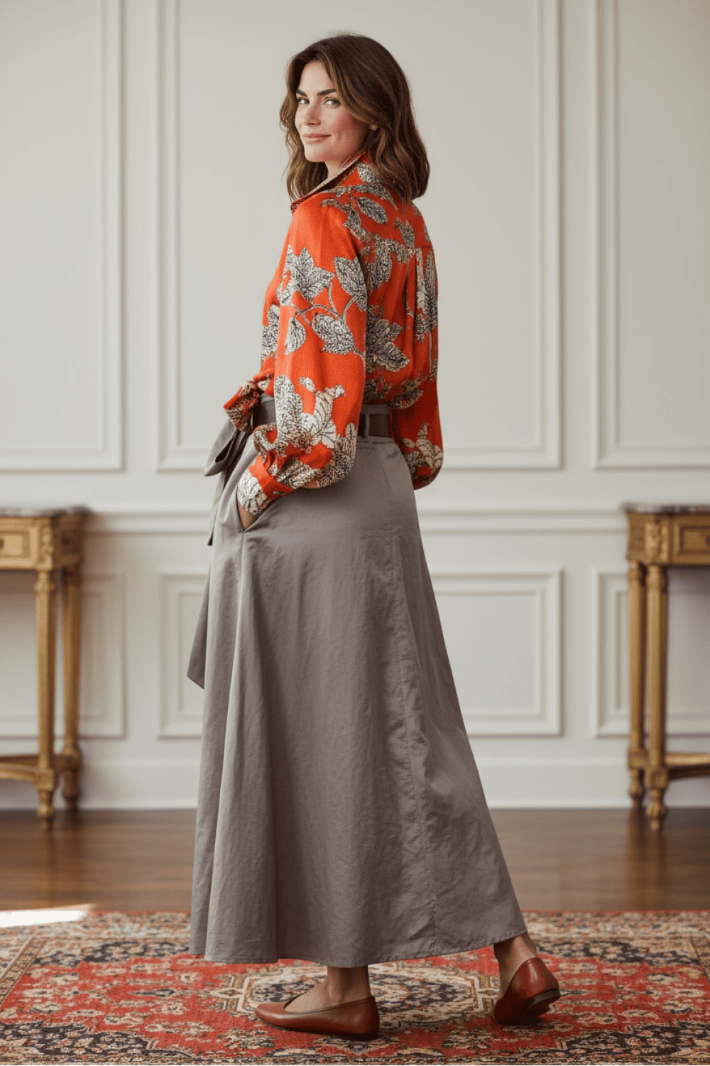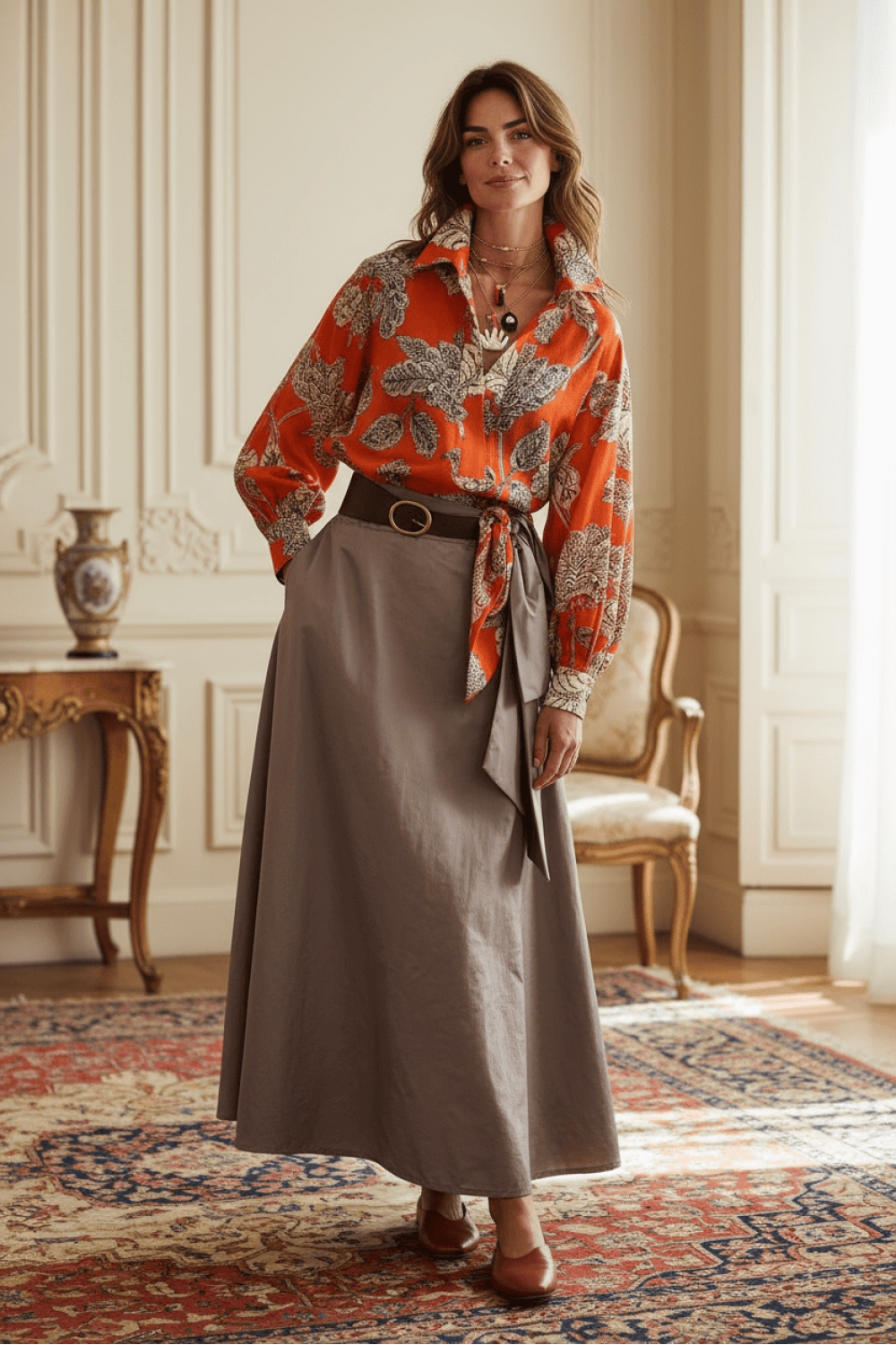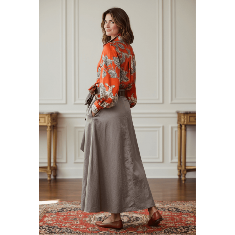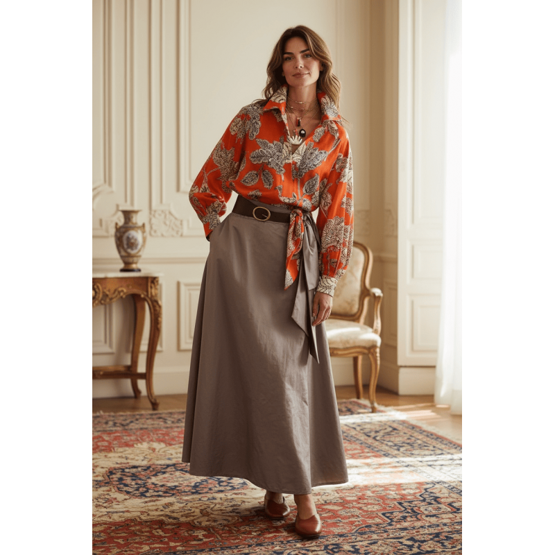 Кошула инспирирана од топлината и изобилството на есенската природа. Со предимензиониран крој и впечатлив принт од лисја во нијанси на портокалова и крем, оваа кошула претставува совршен баланс помеѓу елеганција и удобност. Лесниот и луксузен материјал ѝ дава раскошно движење и сјај, додека широките ракави и лентата за врзување овозможуваат стилско обликување. Идеална за комбинација со макси здолништа, костими или фармерки за боемски шик или рурален гламур.