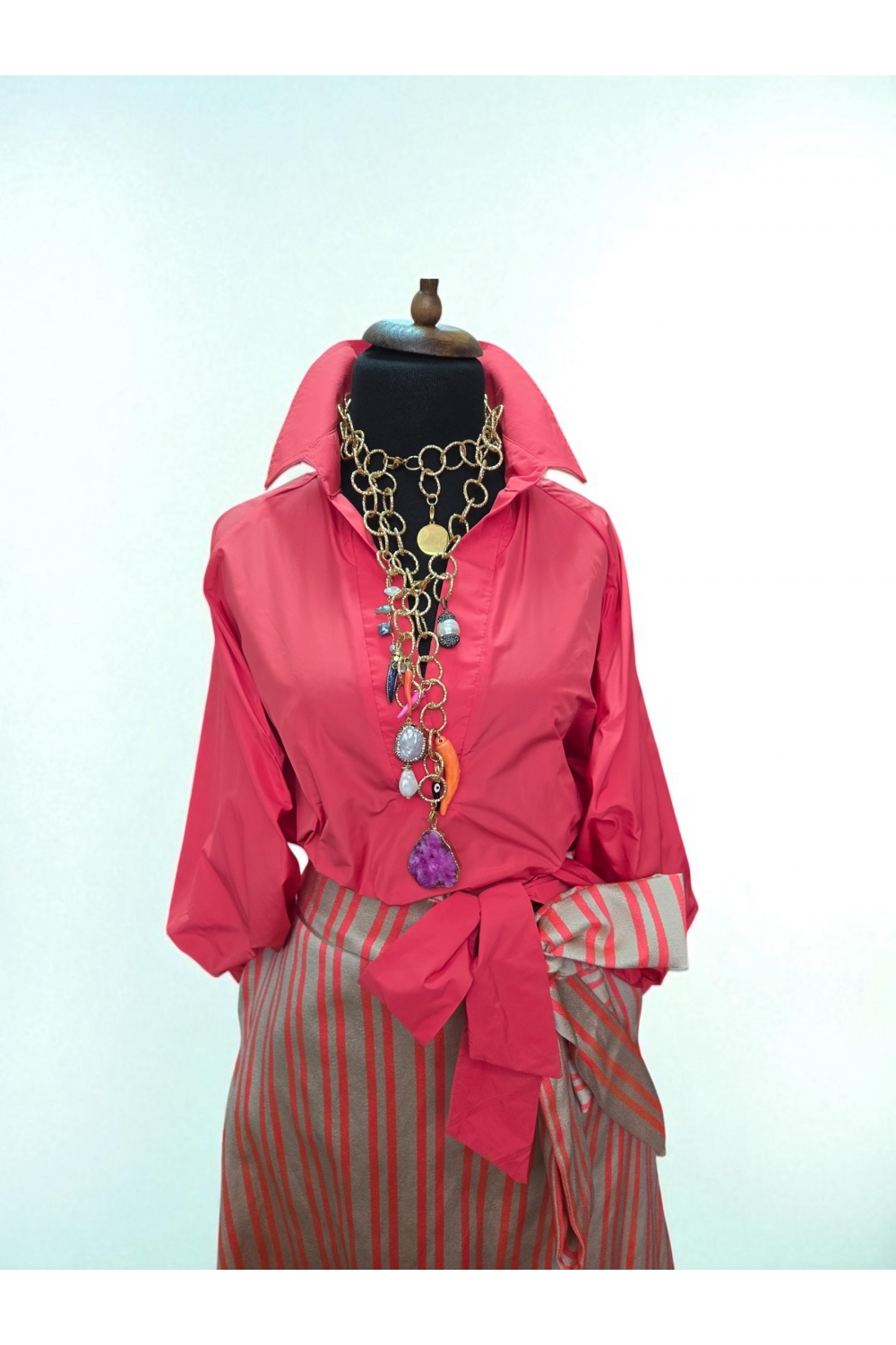 Кошулата „Coral Flame“ е изработена од 100% тафта свила – благородна и луксузна ткаенина која префинето ја одразува светлината. Со впечатлива корално-црвена боја, ова парче остава впечаток каде и да се појавите. Дизајнирана со широки ракави и фино скроен струк што може да се комбинира со здолништа со ремен. Совршена за свечени моменти и вечерни излегувања.