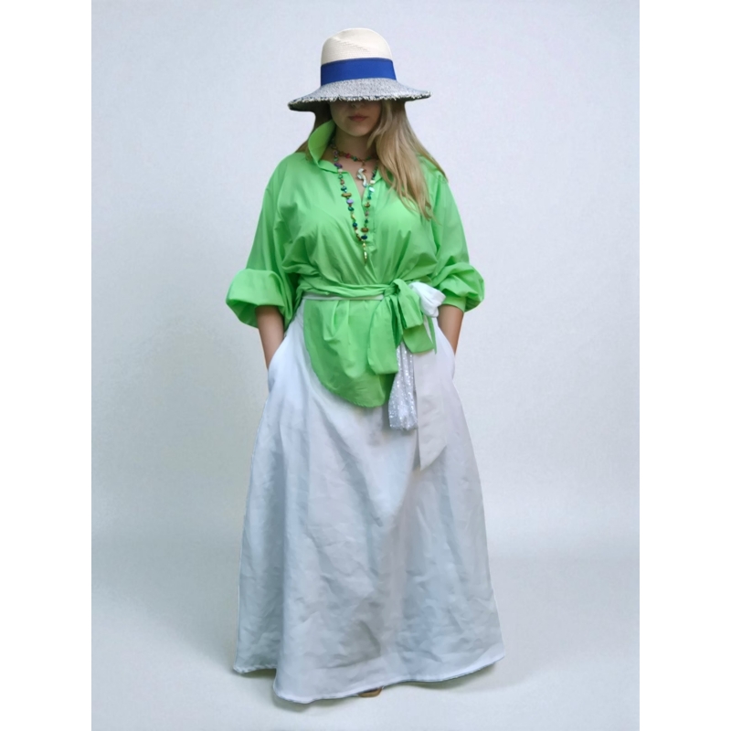 Оваа женска кошула изработена од 100% памук комбинира свежина, удобност и модерен изглед. Со живописна зелена боја и декоративен ремен, таа создава елегантна силуета и е совршен избор за летни денови, прошетки и секојдневни активности. Лесно се комбинира со здолништа, фармерки или ленени панталони за уникатен и стилски изглед.