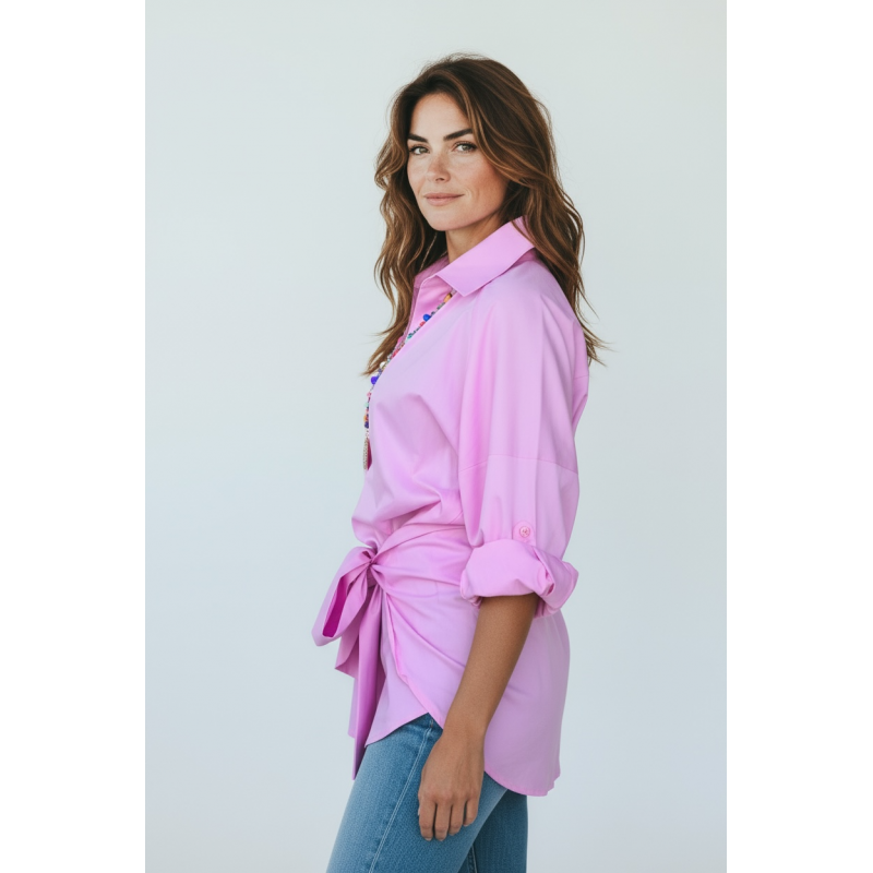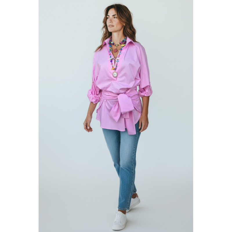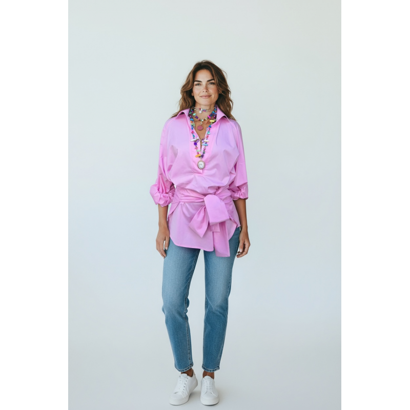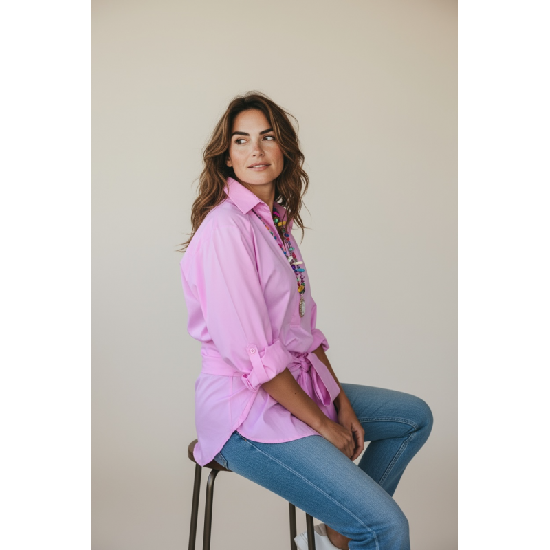 A romantic yet modern statement — the Luxе Rosa Shirt blends feminine elegance with relaxed luxury. Crafted from a smooth cotton-satin blend with a soft sheen, it features a long fluid silhouette and a sculptural bow belt that defines the waist beautifully.