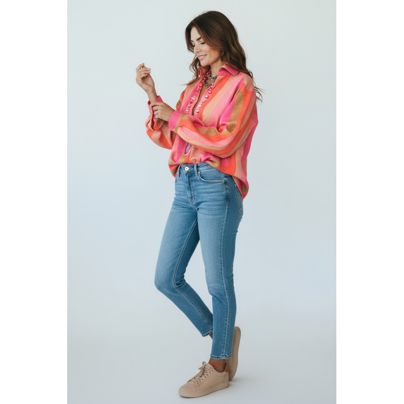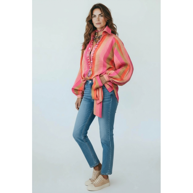 Оваа кошула во розови и корални нијанси е вистински хит. Изработена со лесна и пријатна текстура од греж свила, кошулата има лежерен крој и широки ракави, совршени за цела година. Може да се носи и слободно и врзана во половината, а одлично се комбинира со фармерки, панталони или долги здолништа.