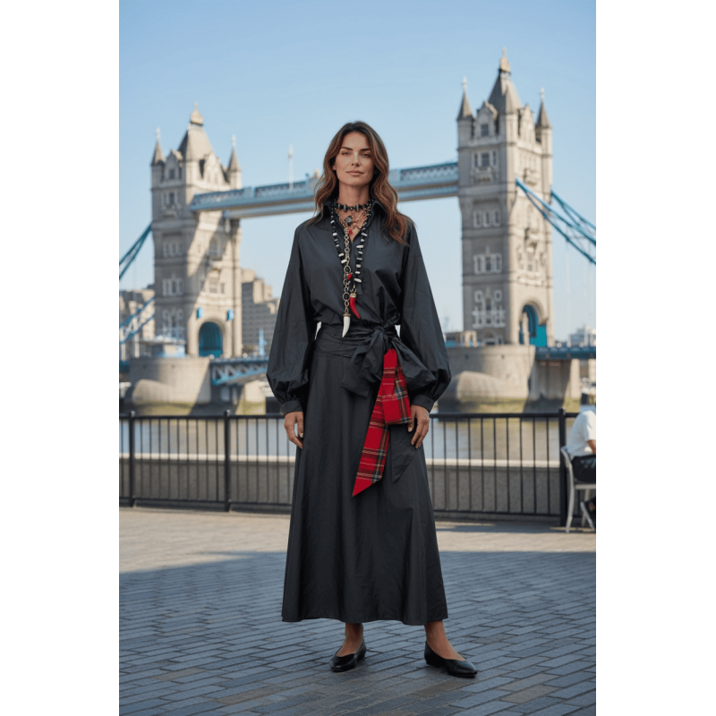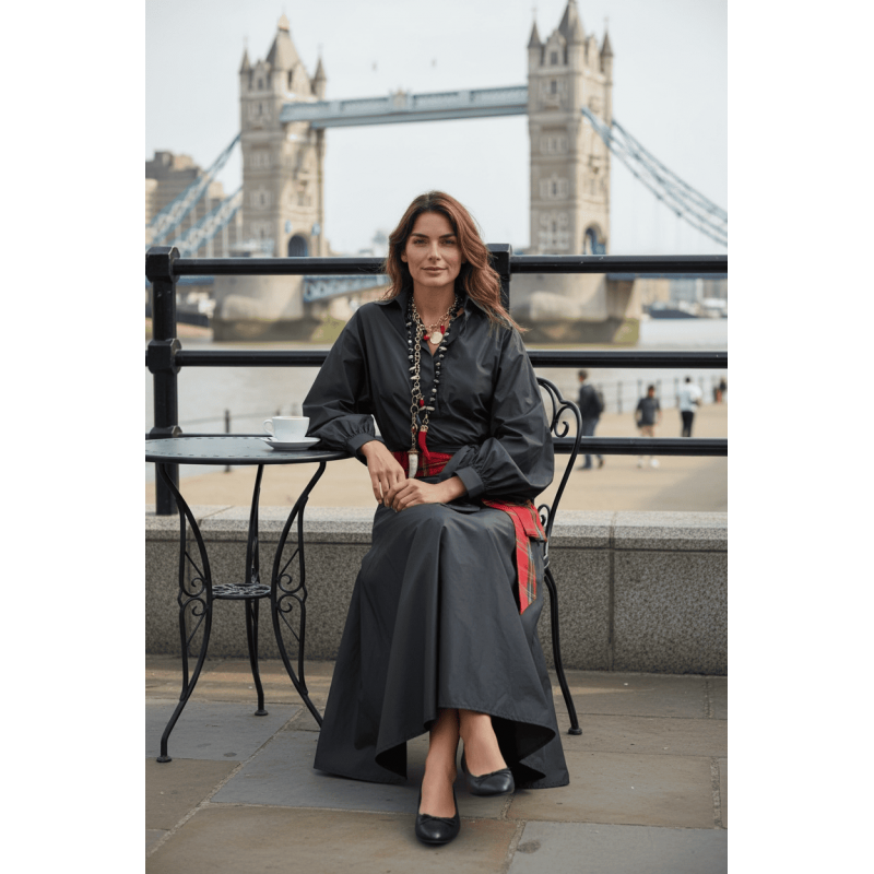 Со пошироки ракави, оваа кошула е создадена да се комбинира со Windsor Антрацит здолниште, создавајќи впечаток на современа силуета што дише со класична британска префинетост.