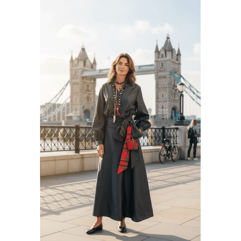 Изработена од луксузна тафта свила со благ сјај и елегантна структура, таа го претставува совршениот баланс меѓу архитектонска форма и флуидност.